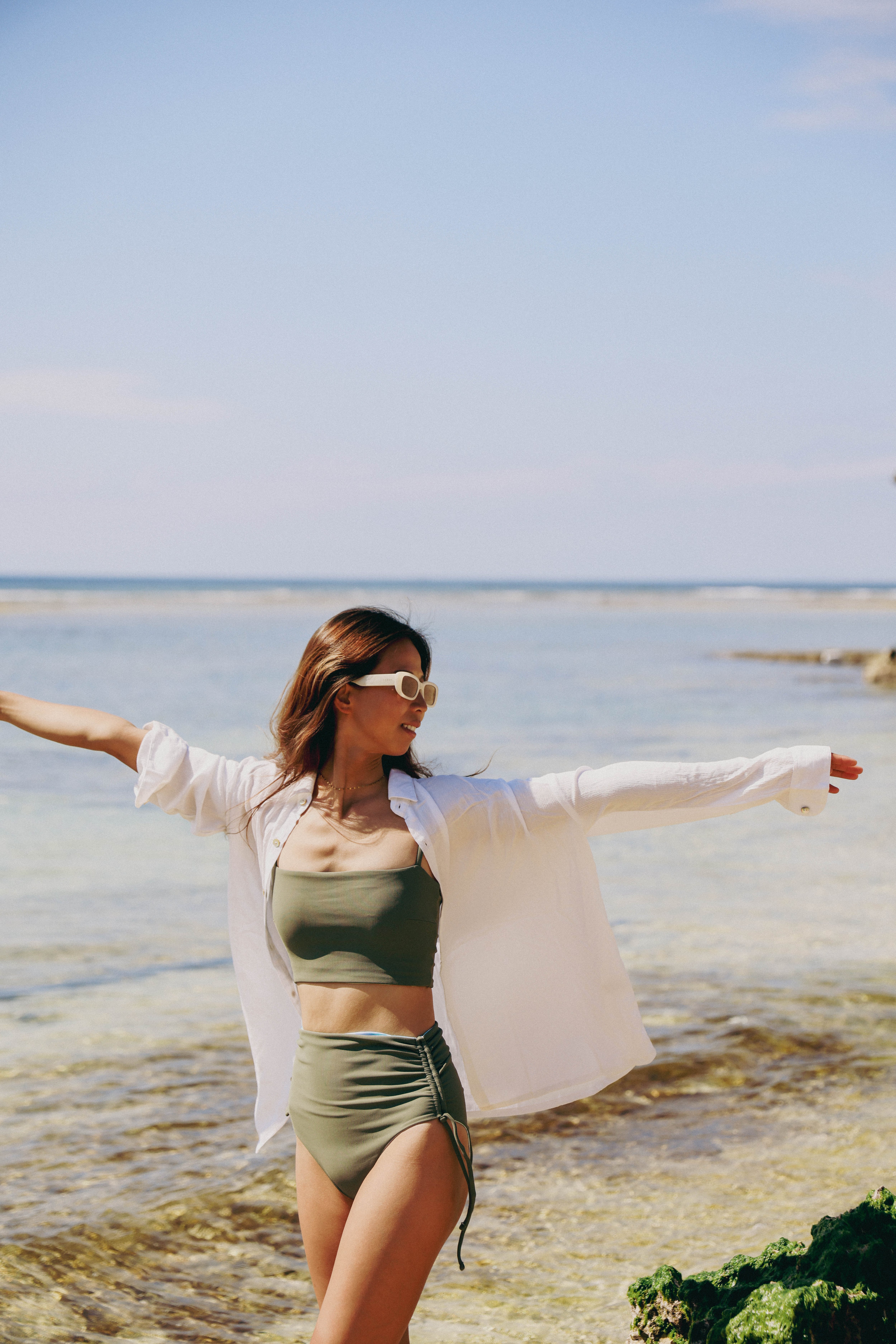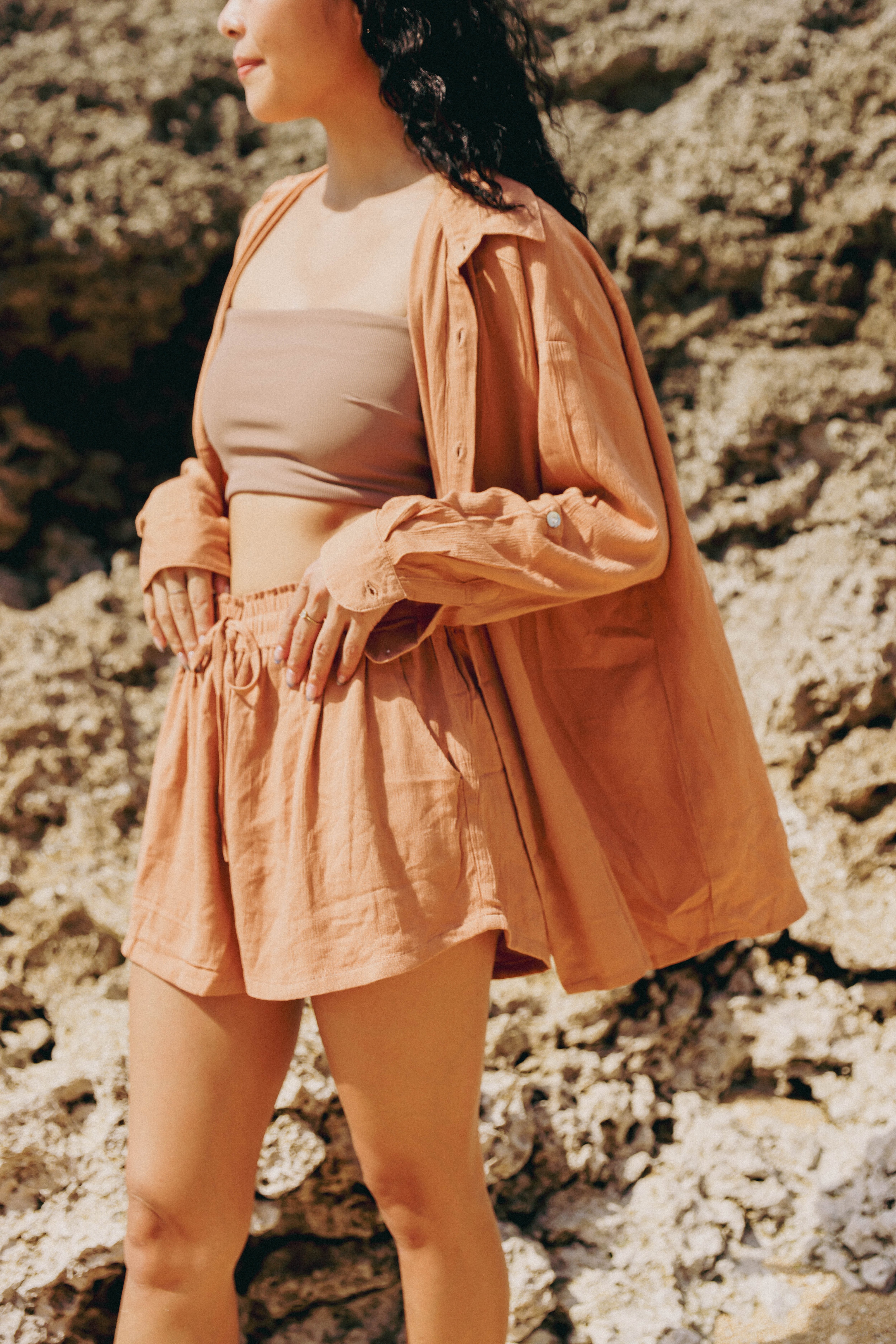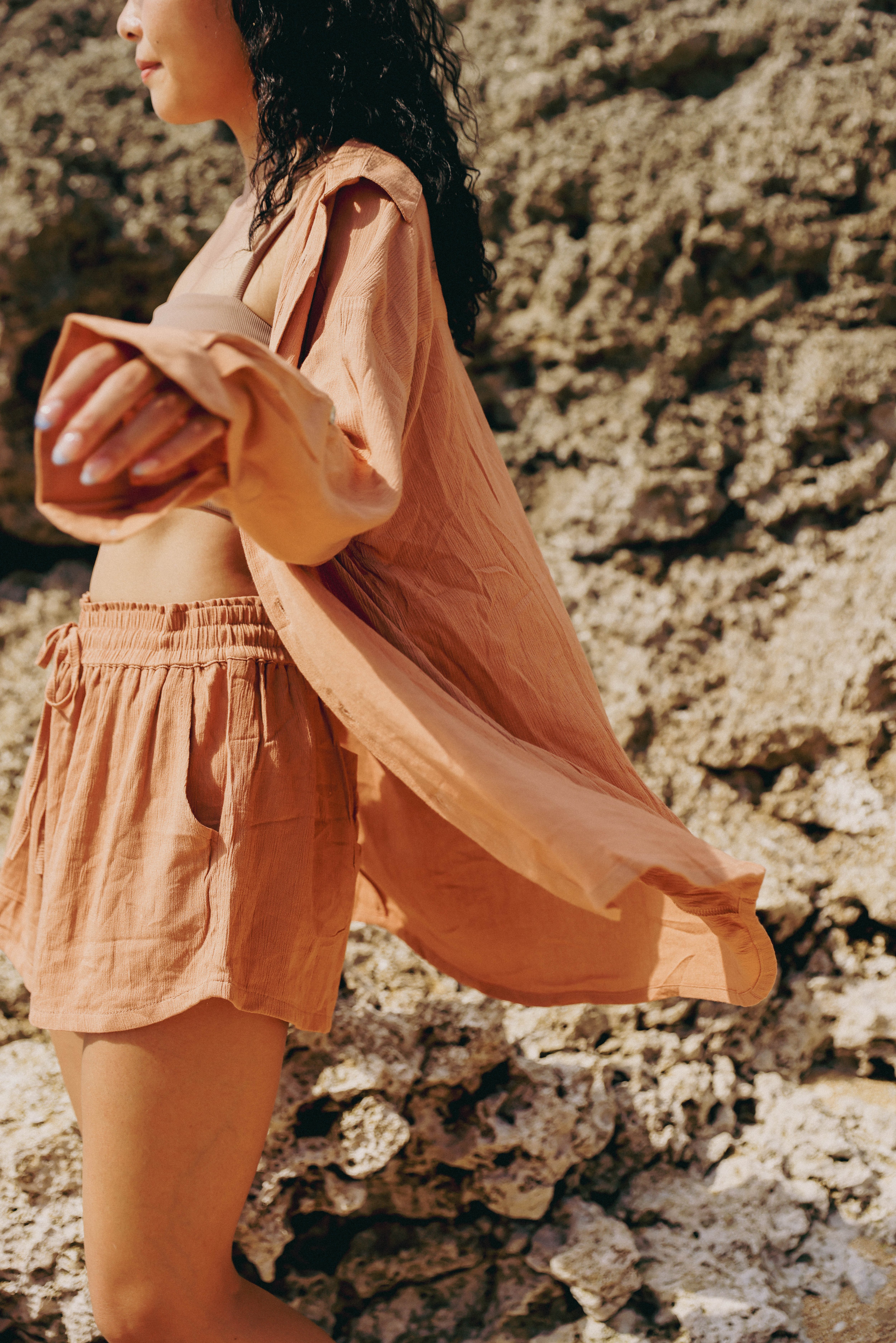 たっぷりのサイズ感なので、水着やヨガウェアの上にもさらっと羽織ったり、お揃い生地のリラックスロングパンツに合わせてセットアップで前裾をタックインして着こなせば街でもオシャレに着こなせます。
