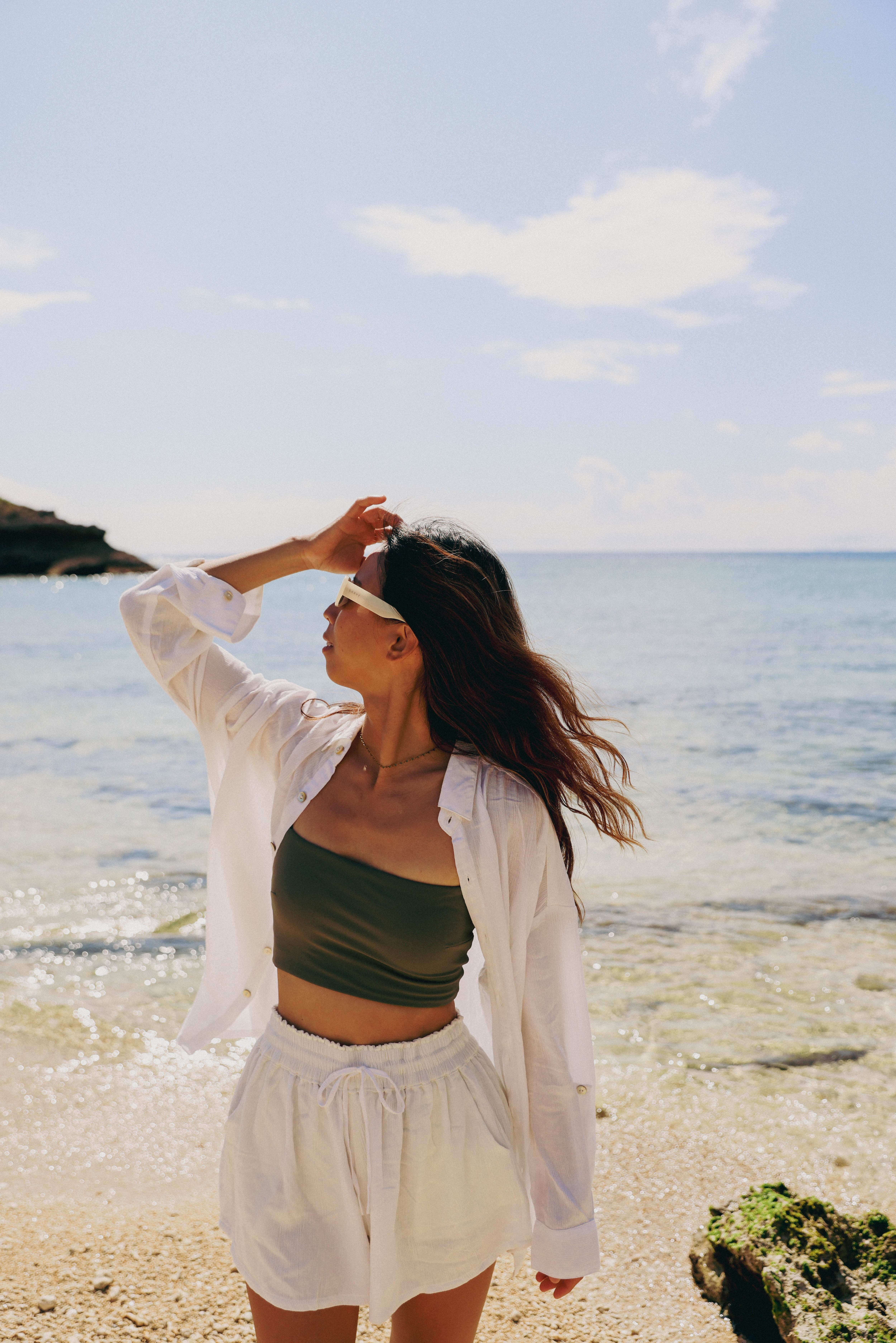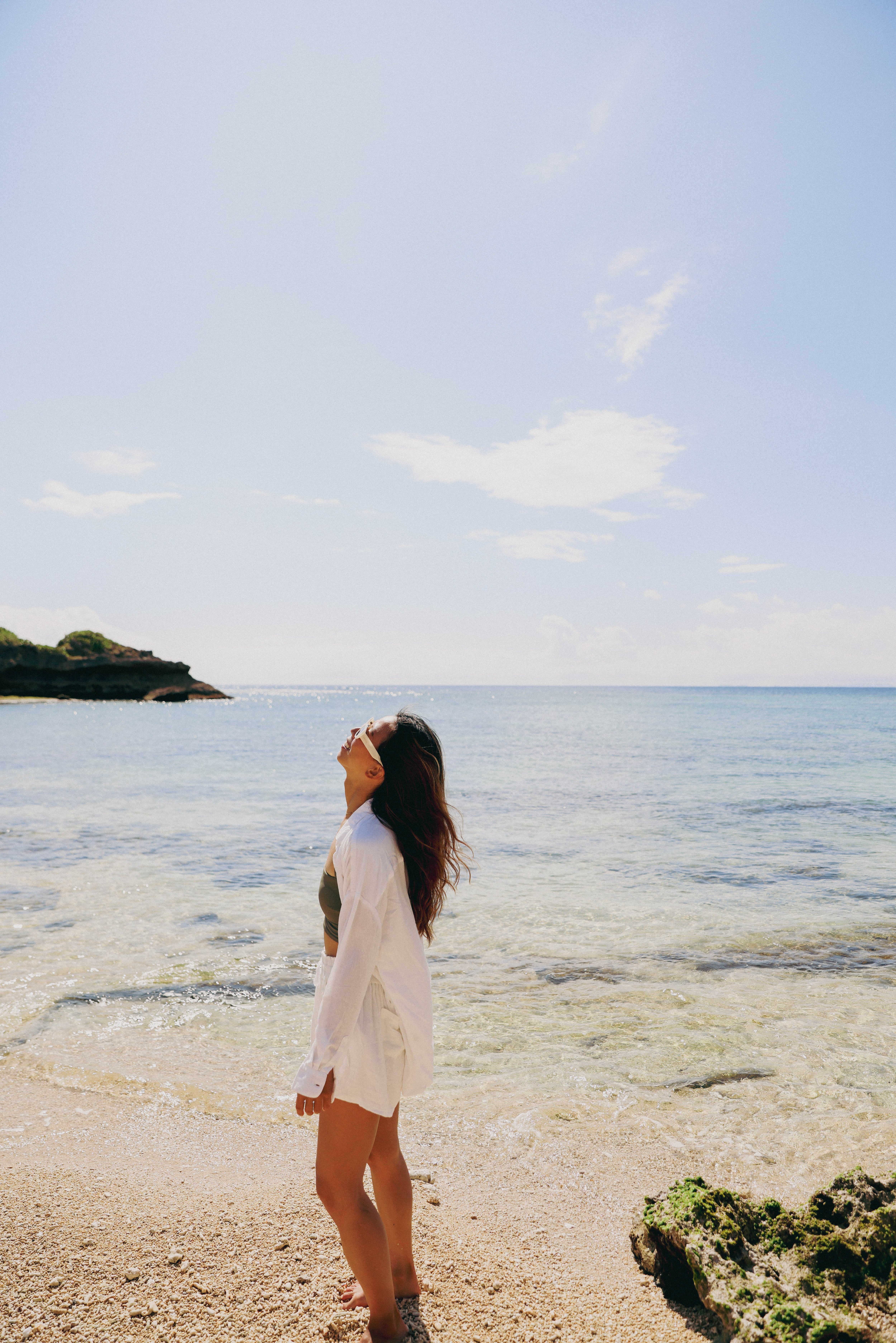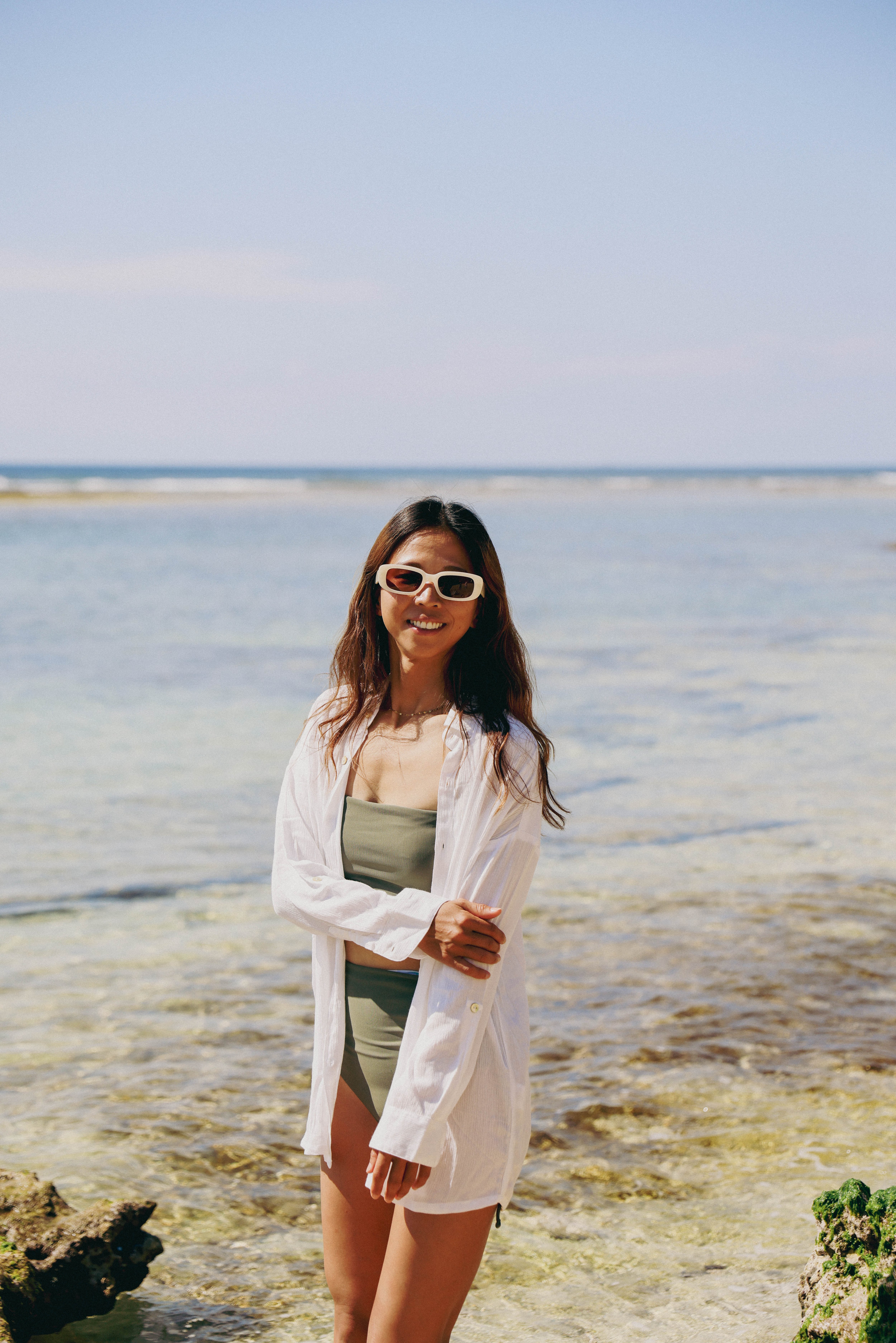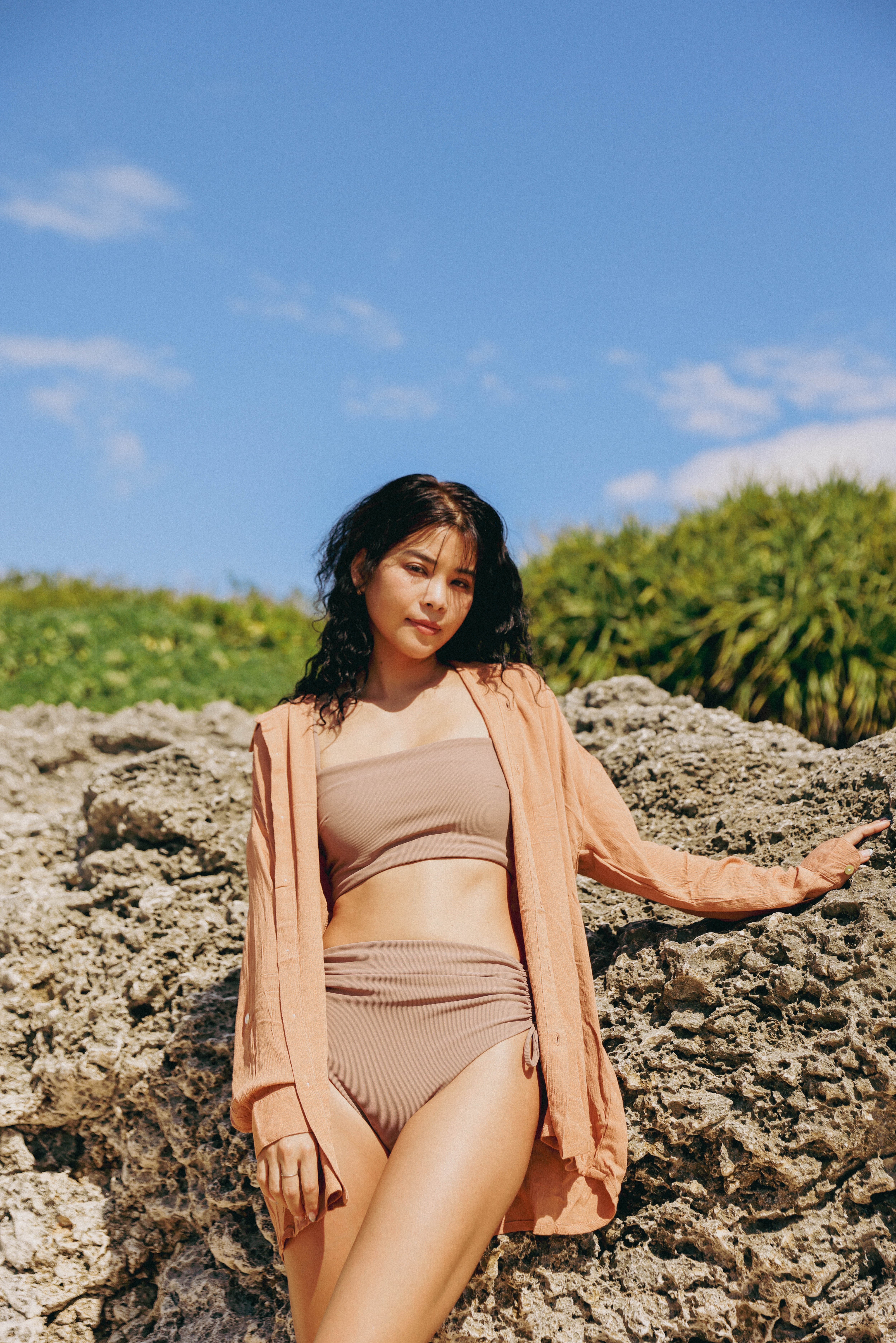 たっぷりのサイズ感なので、水着やヨガウェアの上にもさらっと羽織ったり、お揃い生地のリラックスロングパンツに合わせてセットアップで前裾をタックインして着こなせば街でもオシャレに着こなせます。