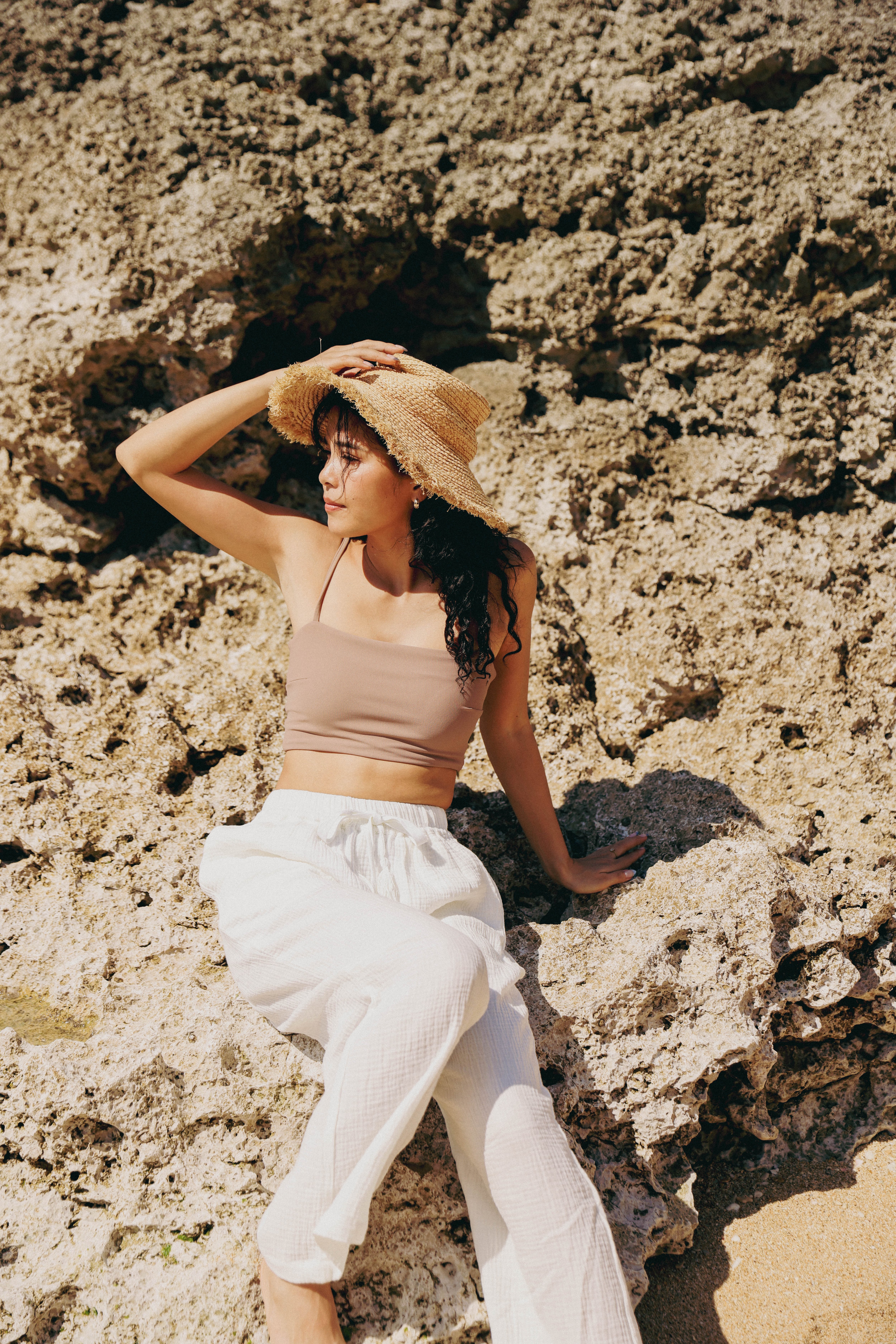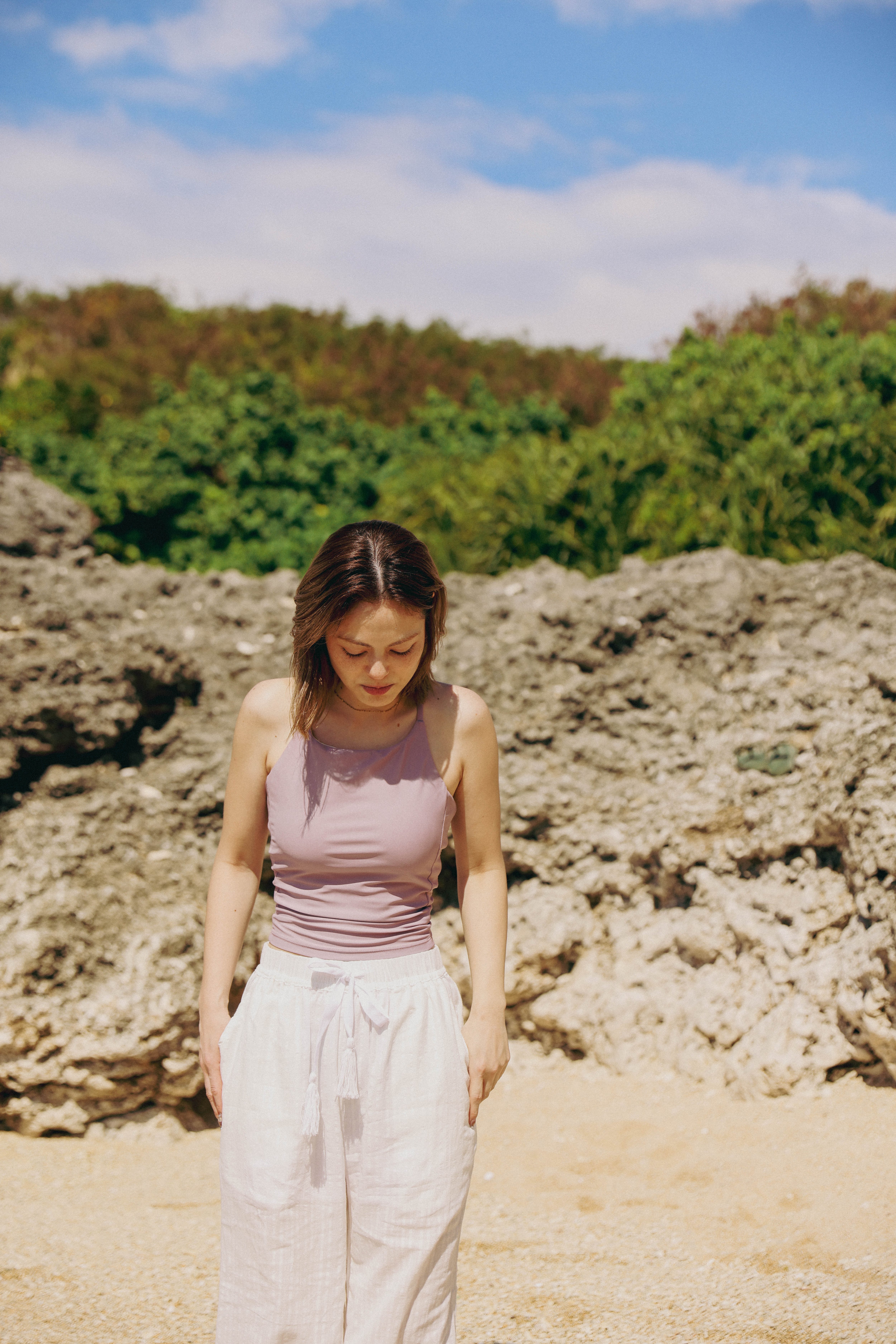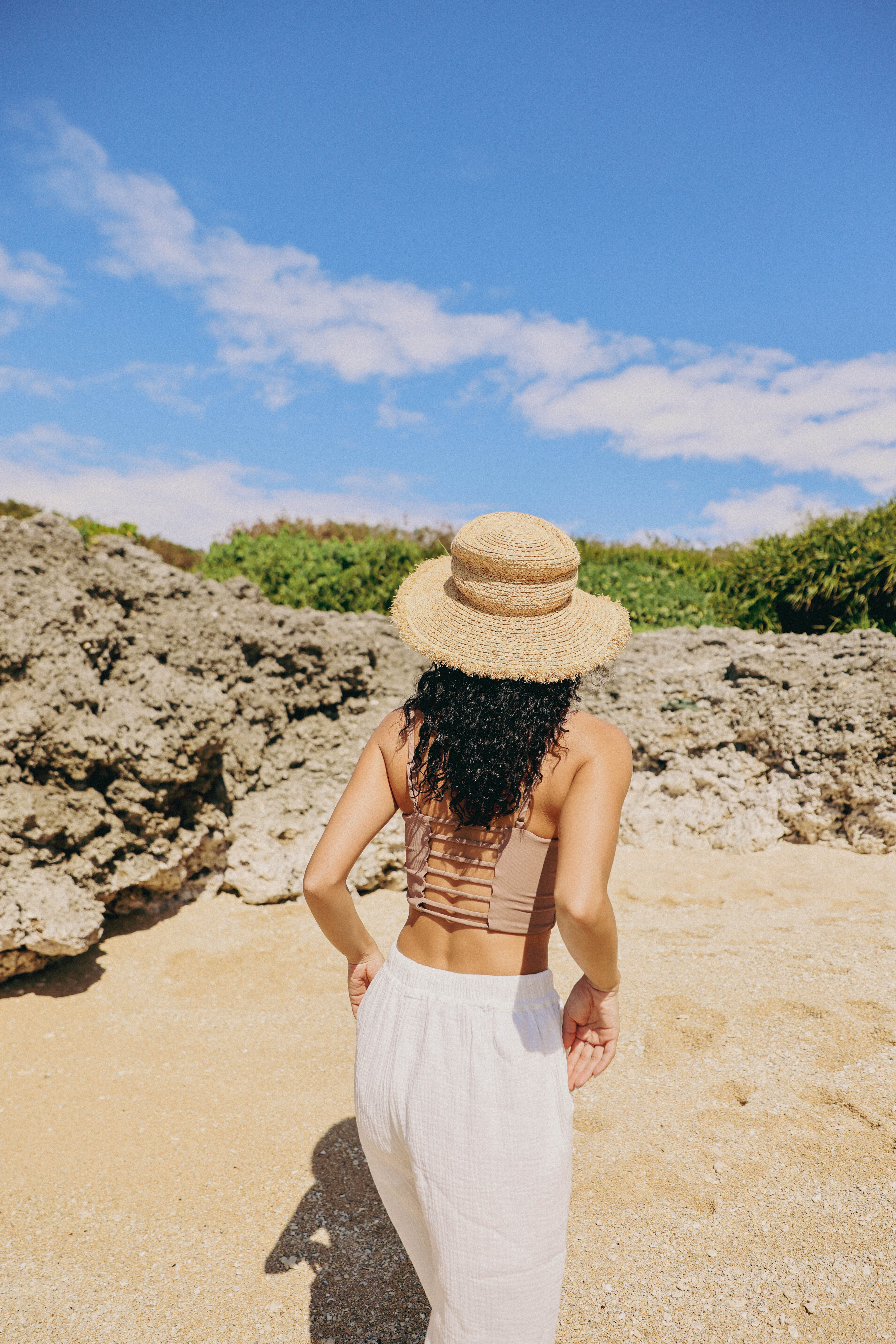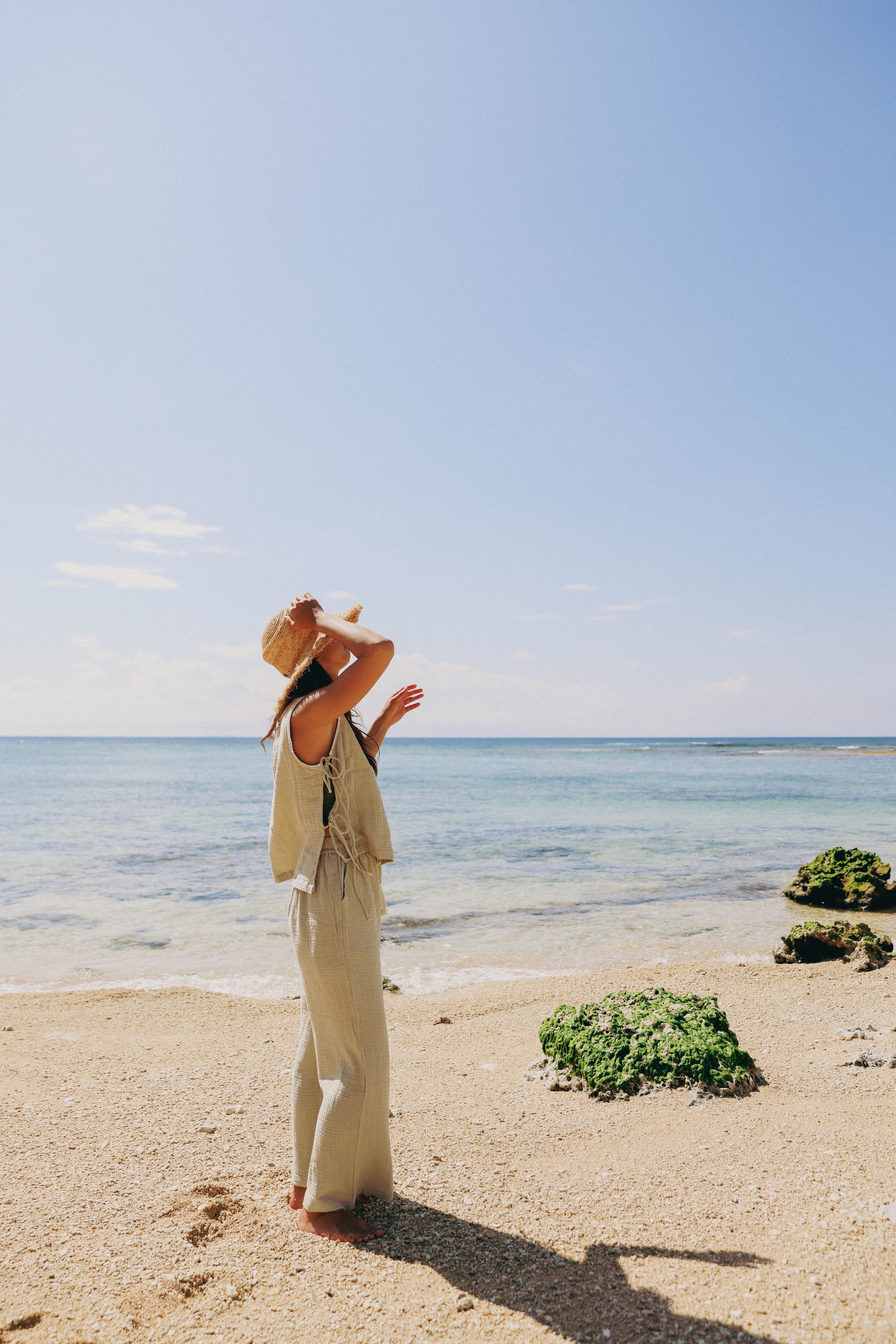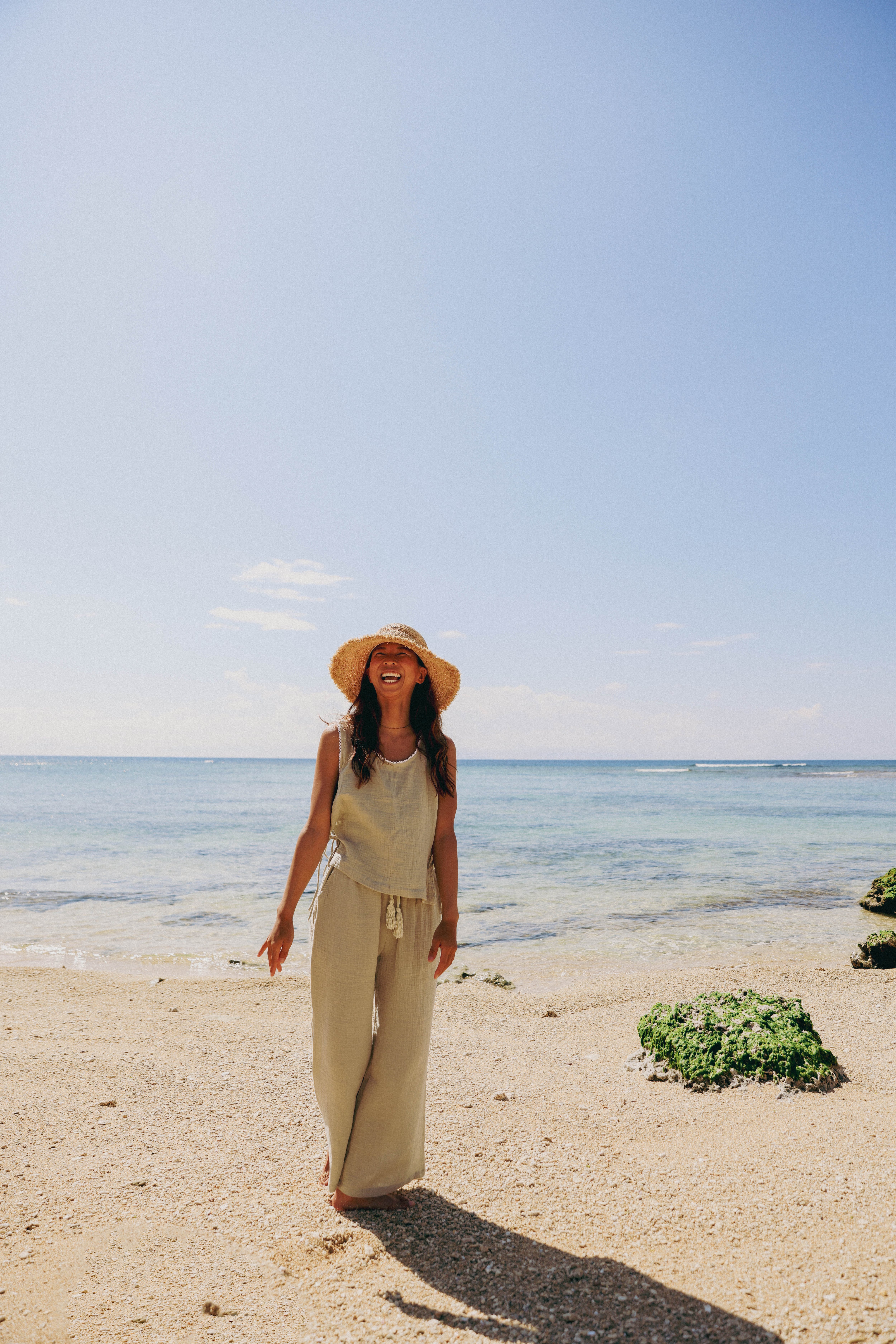 お揃い生地のコットンタンクトップに合わせてセットアップで着こなせば街でも海でも